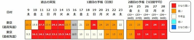 関東甲信地方の向こう2週間の気温は、暖かい空気に覆われやすいため高く、24日頃からはかなり高くなる可能性があるということです。
