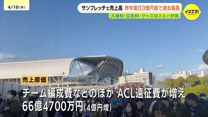 また直接かかった費用にあたる売上原価は、チーム編成費などのほか、ACLに関わる海外遠征費が増え、66億4700万円と4億円増えました。サンフレッチェは「応援してくださる方々との夢と感動の共有が実現できるよう、引き続きチーム作りに取り組んで参ります」としています。