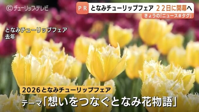 75回目のことしは「想いをつなぐとなみ花物語」をテーマに300品種350万本のチューリップが会場を彩るほか、高さ4メートル・長さ30メートルの雪の大谷を花で再現した「花の大谷」や迫力の地上絵が描かれた大花壇などが来場者を出迎えます。