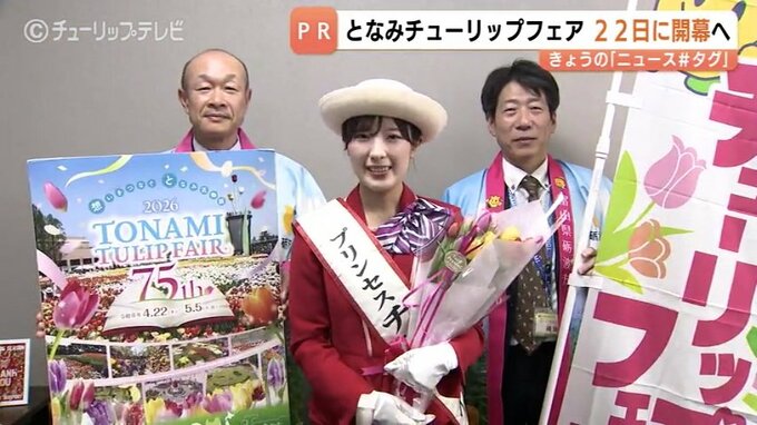 22日(水)に開幕するとなみチューリップフェアをPRするため、プリンセスチューリップの前田結衣さんらが26日、チューリップテレビを訪れました。
