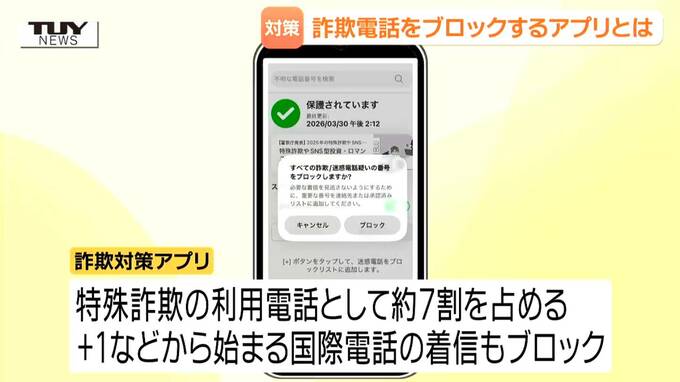こうした被害をなくそうと、このアプリが開発されました。民間企業が制作したもので、これまで特殊詐欺に使われた電話番号が登録されていて、その番号からの着信をブロックするほか、特殊詐欺の利用電話としておよそ7割を占める、+1などから始まる国際電話からの着信もブロックすることができます。