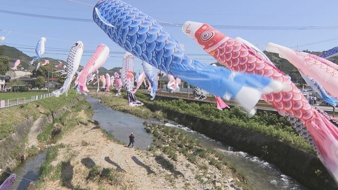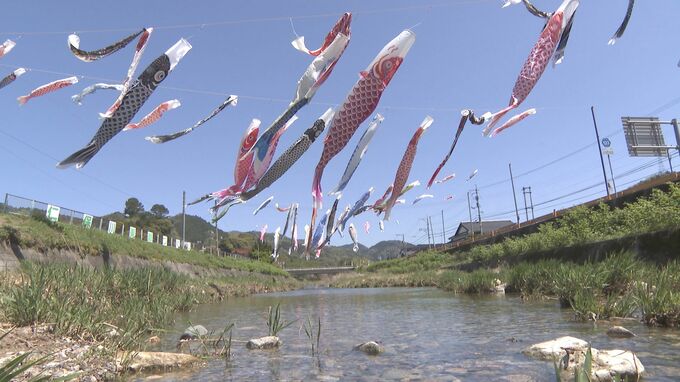 山口市の仁保川で、色とりどりのこいのぼりが元気に泳ぎ始めました。