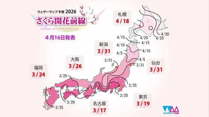 この週末に桜の開花前線は北海道まで北上するでしょう。札幌と函館の開花日は4月18日の予想で、最終地点の稚内は5月2日の見込みです。