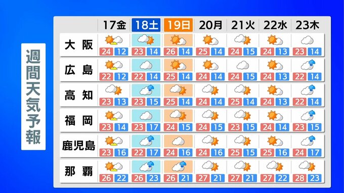 土曜日は、四国や九州南部では一時雨が降る所がありそうです。そのほかの地域は、午後は日差しが届く見込みです。日曜日以降は、25℃以上の夏日の所が出てくるでしょう。