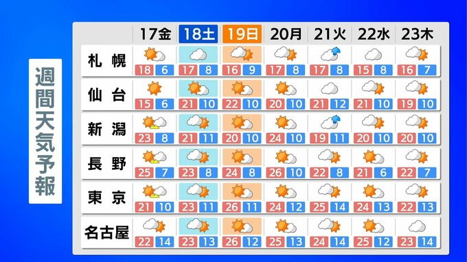 土曜日は、秋田や北海道の道北などでは雨が降る所がありそうですが、そのほかの地域は晴れる見込みです。また日曜日・月曜日は広く晴れるでしょう。日曜日の予想最高気温は、東京や名古屋は26℃、また月曜日は長野で26℃まで上がる予想で、汗ばむ陽気となりそうです。