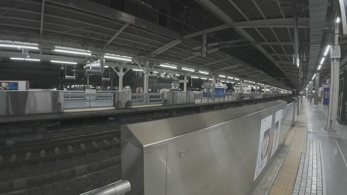 「電光掲示板、何も表示されていません。ホームには誰もいませんが、ホームの下では110人の方が今、働いています」