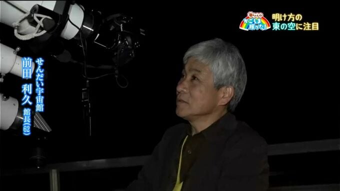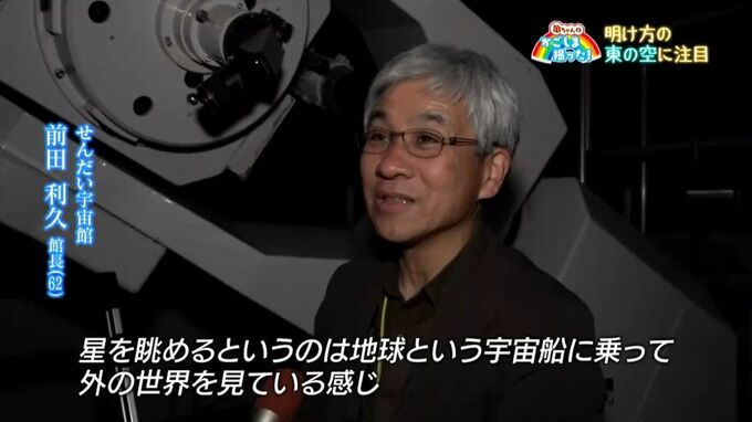 (せんだい宇宙館 前田利久館長・62)「星を眺めるというのは、地球という宇宙船に乗って、外の世界を見ている感じ。今回も太陽に近づいた天体の姿を見ることができてうれしい」