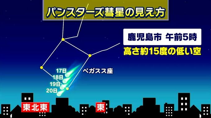 パンスターズ彗星はよく晴れた日の明け方、東の空のペガスス座付近に見えます。