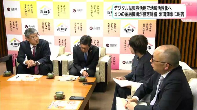 デジタル振興券の活用で地域の活性化につなげようと高知県内の4つの金融機関が協定を締結し、濵田知事に報告しました。協定を締結したのは高知信用金庫、四国銀行、高知銀行、幡多信用金庫で、このほどデジタル振…