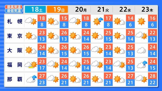 関東甲信・北陸・東海・近畿・中国・四国・九州北部(山口県を含む)・九州南部地方では、4月22日頃から、この時期としては10年に一度程度しか起きないような著しい高温になる可能性があるとしています。