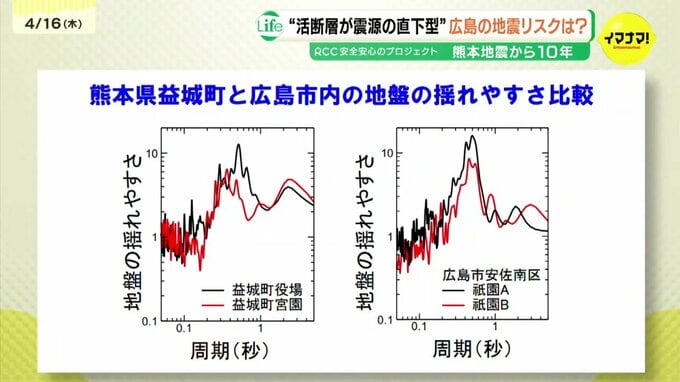 これは益城町と広島市の揺れやすさを比較した図です。横軸が「揺れの周期」、縦軸は「地盤の揺れやすさ」を示しています。広島市のグラフは益城町と同じような形になっています。