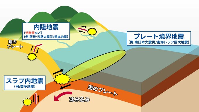 海のプレートが、年間数cmずつ陸側に動いています。爪が伸びるより少し早いくらいのスピードです。これにより、ひずみが生まれます。プレート境界地震の代表が、東日本大震災や南海トラフ巨大地震。