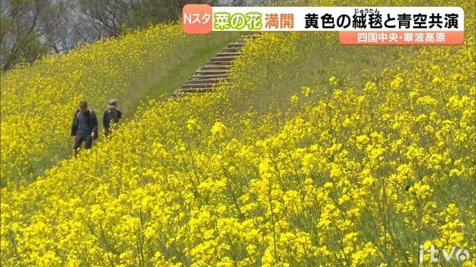 四国中央市の翠波高原では、菜の花が満開となっていて、鮮やかな黄色の絨毯と甘い花の香りが訪れた人を楽しませています。標高およそ900メートルにある翠波高原では、およそ3ヘクタールに植えられた30万本の菜…