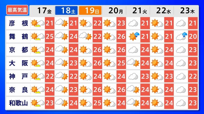 近畿地方の向こう2週間の気温は、暖かい空気に覆われやすいため高く、22日頃からはかなり高くなる見込みです。