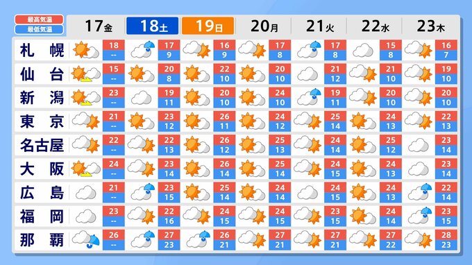 また、あす18日(土)は上空の寒気を伴った気圧の谷が通過する見込みで、北日本を中心に大気が不安定になりそうです。落雷や突風、ひょう、急な強い雨に注意してください。