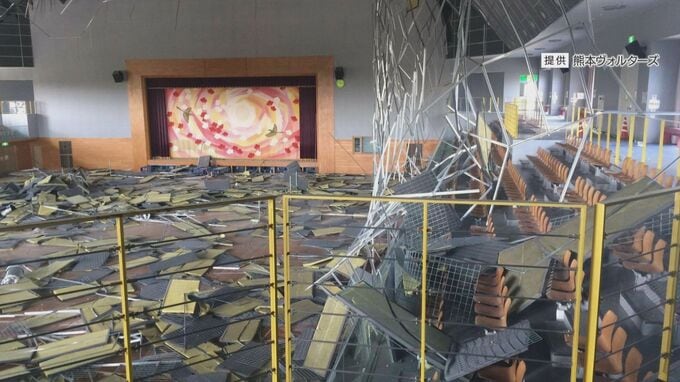 練習拠点だった体育館も天井や照明が崩れ落ち、無残な姿に変わり果てていました。