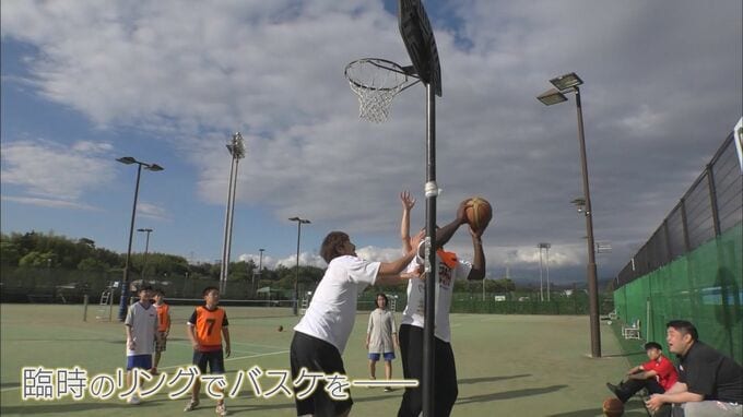 避難所の子どもたちの声に応え、臨時のリングを持ち寄り、バスケ教室も開きました。