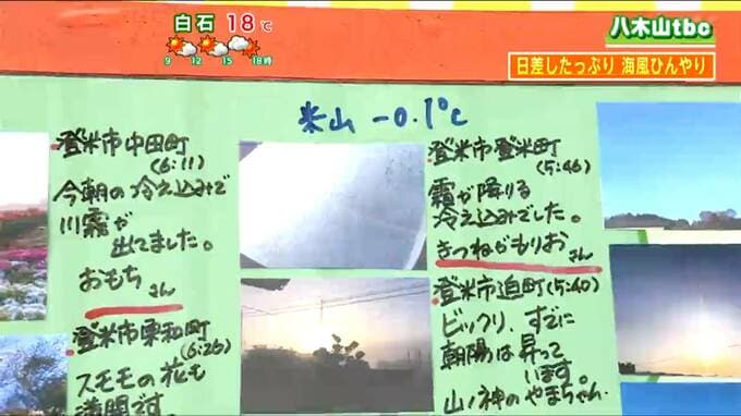 17日朝は晴れている場所が多い一方、16日夜からの放射冷却の影響で冷え込みが強まりました。登米市登米町では車のフロントガラスに白く霜が降りたとの情報が寄せられています。17日朝の最低気温は米山で氷点下0.1℃など、果物への霜の影響が心配されます。