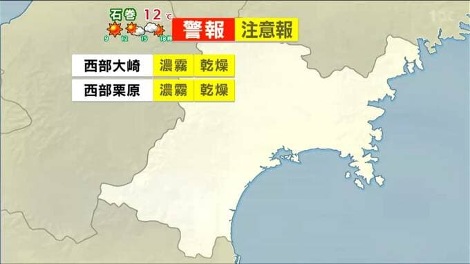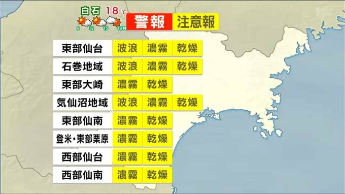 宮城県内全域に濃霧と乾燥の各注意報、沿岸地域には波浪注意報が発表されています。