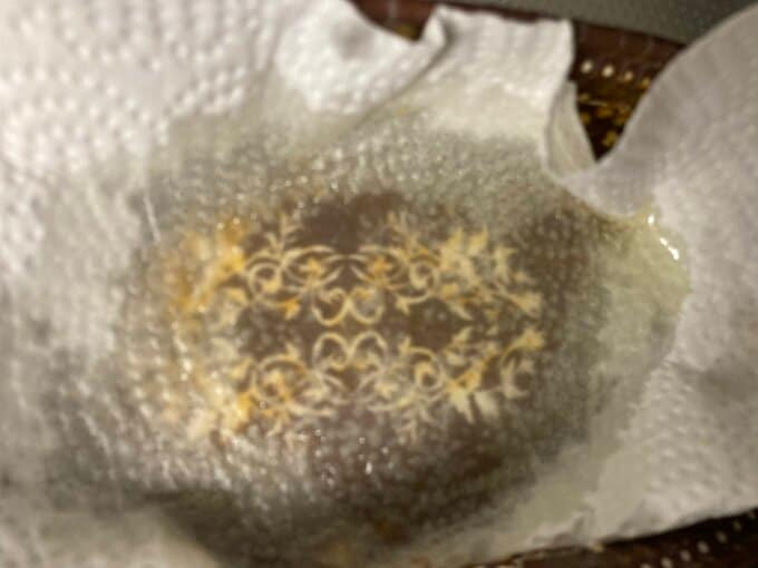 実際にキッチンペーパーを敷いたトレイに、食用油のプラボトルを逆さにして油を落とす様子を画像とともに紹介しました。