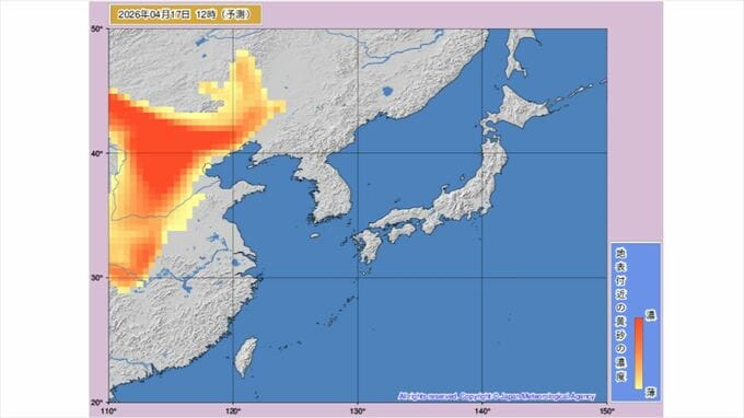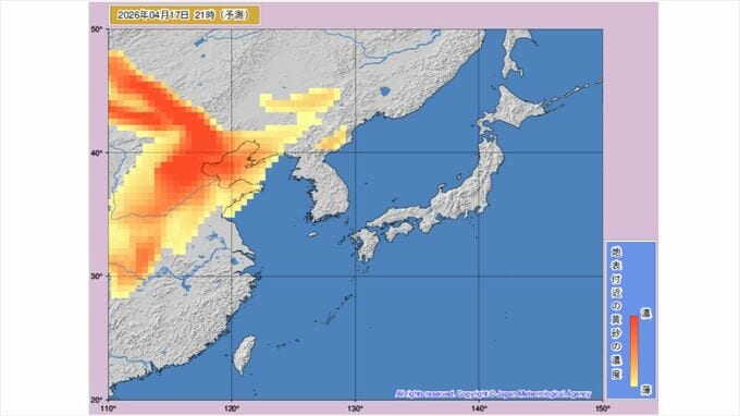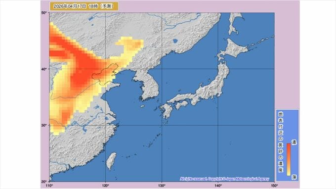 【黄砂情報】黄砂飛来か 20日に東北や北海道に 気象庁の「黄砂情報」シミュレーション テレビ山梨 2026年4月17日(金) 11:30 国内 天気 黄砂はいつ・どこに? 気象庁の黄砂解析予測図 気象庁の黄砂解析予測図は当日から1日先まで3時間ごと、2日先から3日先まで6時間ごとの予測になっています。 17日(金)のシミュレーション