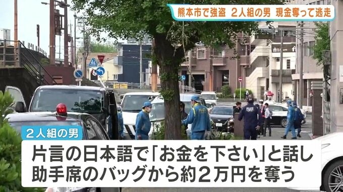 警察によりますと、4月17日午前4時40分ごろ、熊本市中央区慶徳堀町の路上に車を止めていた50代男性から「2人組に襲われて金をとられた」と110番通報がありました。