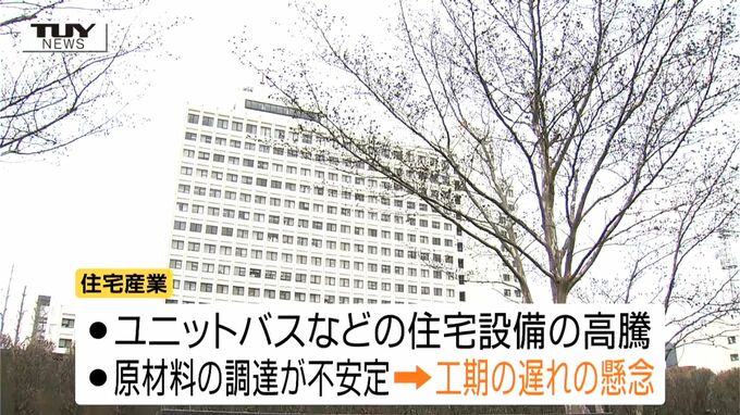 県の聞き取りによりますと、住宅産業では、ユニットバスといった住宅設備や、断熱材塗料などの資材が高騰しているほか、原材料の調達が不安定になっていることからハウスメーカーからは工期の遅れを懸念する声が上がっているということです。