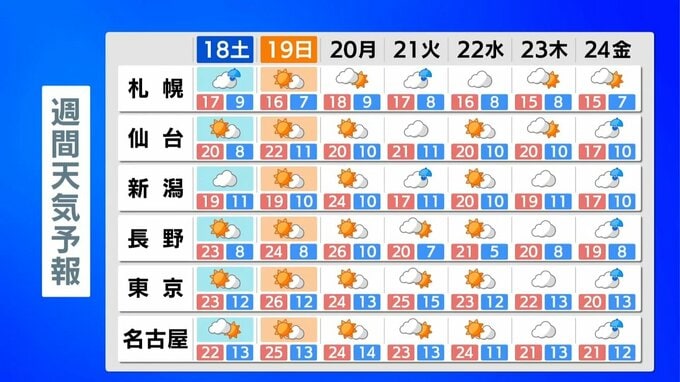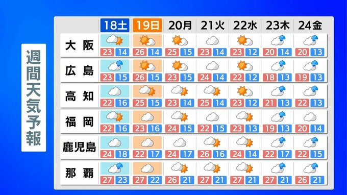 あす18日(土)も東海や関東では日ざしに恵まれるでしょう。そのほかは雲が広がり、急な雨の可能性があります。あさって19日(日)は中国・四国から北海道にかけて晴れて、西日本や東日本では25℃以上の夏日が続出するでしょう。急な暑さによる熱中症にお気をつけください。朝晩はまだ東日本を中心に空気がヒンヤリするため、一日の気温差でも体調を崩さないよう気をつけた方がいいでしょう。