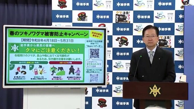岩手県「春のツキノワグマ被害防止キャンペーン」18日から実施 クマ情報共有アプリ登録者が1か月で倍増 IBC岩手放送 2026年4月17日(金) 13:10 国内 冬眠明けでクマの活動が活発化し、行楽や山菜採りで人がクマの生息域に立ち入る機会も増えることから、18日から5月末まで「春のツキノワグマ被害防止キャンペーン」を展開すると発表しました。