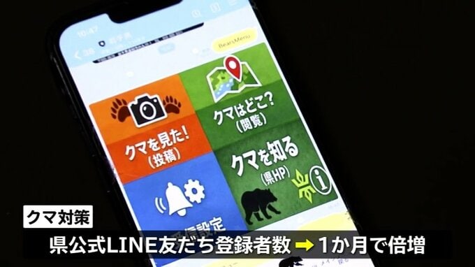 岩手県「春のツキノワグマ被害防止キャンペーン」18日から実施 クマ情報共有アプリ登録者が1か月で倍増 IBC岩手放送 2026年4月17日(金) 13:10 国内 また、クマ被害防止を目指し県が3月24日に運用開始したクマ出没情報の共有アプリ「ベアーズ」について、アプリの利用に必要な県の公式LINEの友だち登録者数が2月末の7486人から、3月末には1万4967人に倍増したことを明らかにしました。