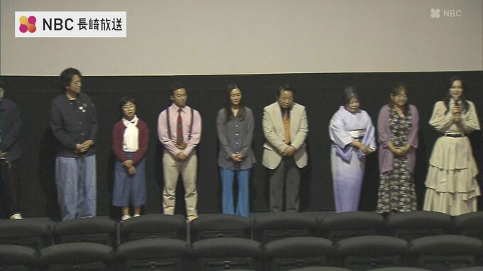 16日夜、長崎市で行われた試写会には佐世保市出身の横尾初喜監督のほかオーディションで選ばれた県民キャストなど15人が登場しました。