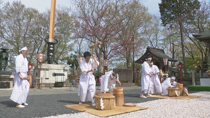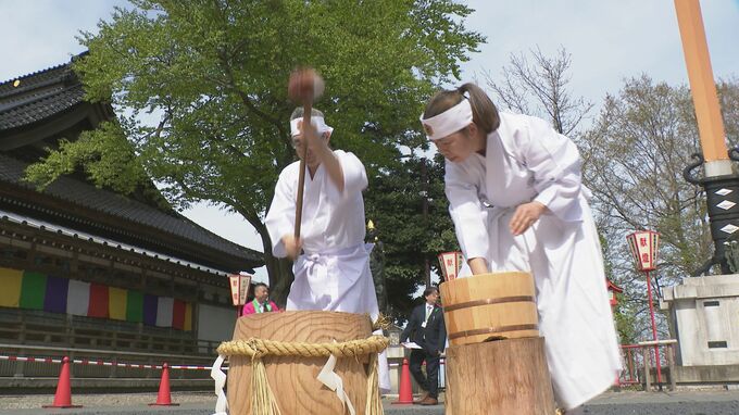 18日から「八重桜まつり」が開かれるのを前に、17日は関係者らが「身も心も清らかでありますように」との願いを込め餅をつく、「厄除け念仏赤餅」の餅つきが行われました。