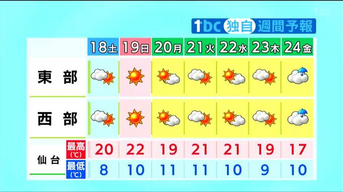 最高気温・最低気温ともに、平年より高く、日曜は6月上旬並みの陽気になりそうです。