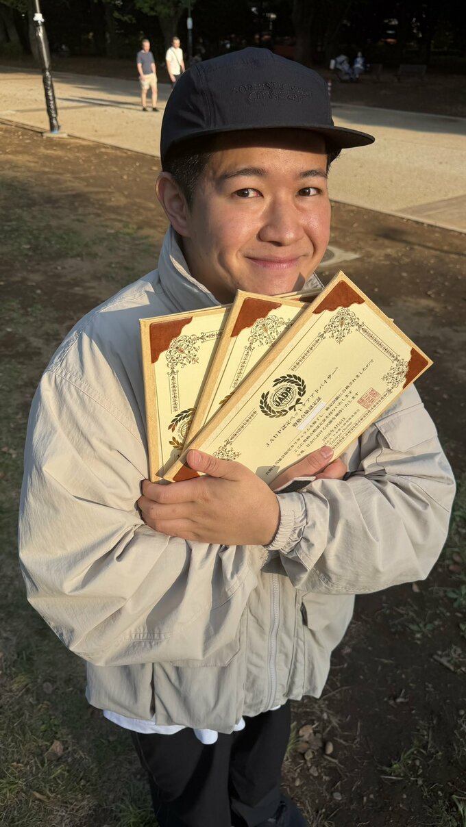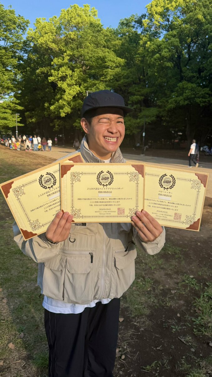 ところが、その手に持っている資格証は3枚。サトシさんは「ケムさん宅には猫ちゃんもいるとのことで」「『ペットセラピスト』と『ペットケアアドバイザー』の資格も同時にトリプルget!」と、驚くばかりの意欲を見せました。