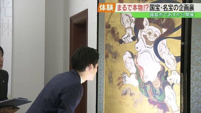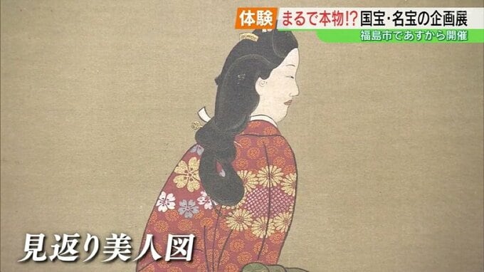 中でも、江戸時代を代表する浮世絵師菱川師宣の「見返り美人図」は、着物の模様や質感まで繊細に表現されています。17日は開幕を前にオープニングセレモニーが行われ、福島市の馬場市長が実際に作品を見て回り、その再現度に驚いていました。