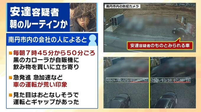 南丹市内の会社の人によると、「毎朝7時45分~50分ごろに、黒のカローラが自販機に飲み物を買いに立ち寄っていた」ということです。