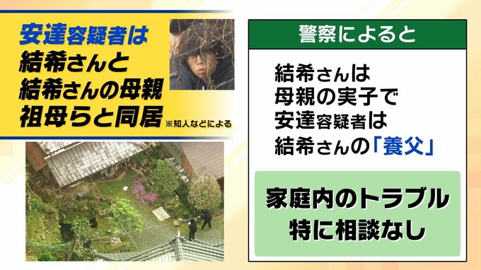 警察によると、結希さんは母親の実子で、安達容疑者は結希さんの「養父」にあたり、家庭内トラブルなどの相談は特になかったそうです。