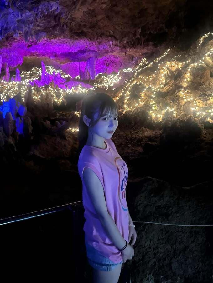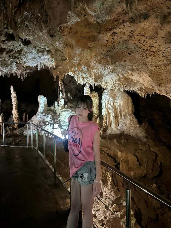 また、観光スポットである鍾乳洞での写真も複数公開。ライトアップされた鍾乳洞内で、天井から垂れ下がる鍾乳石を見上げたり、幻想的な光の中で佇んだりと、神秘的な空間を満喫する表情が印象的です。