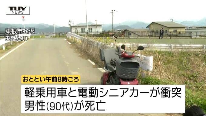 この事故は、おととい午前8時ごろ、東根市松沢の交差点でおきたもので、軽乗用車と電動シニアカーが出合い頭に衝突し、シニアカーに乗っていた90代の男性が死亡しました。