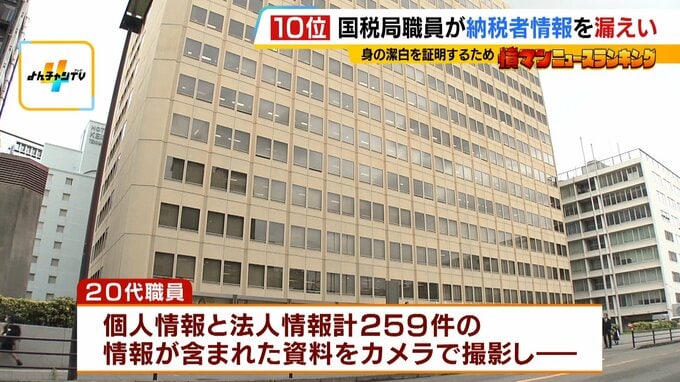 なぜ国税局職員は『納税者情報』を漏洩させてしまったのか? 20代の大阪国税局職員と警察名乗る男 2時間やりとりの詳細は… 毎日放送 2026年4月18日(土) 09:00 国内 「計259件の情報」写真108枚をLINEで送信 職員は、個人情報179件、法人情報80件の計259件の情報が記載された資料をスマホで写真を撮影。 108枚にも及ぶ写真をLINEで送信したということです。その様子に同僚が気づいていました。