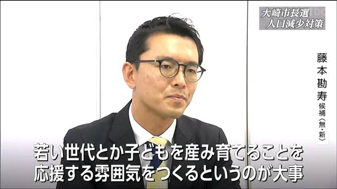 元大崎市議の新人・藤本勘寿さんは、市役所の中に子育てに関する相談や申請の補助をする部門を設置し、子育てしやすい雰囲気を作る必要があると訴えます。