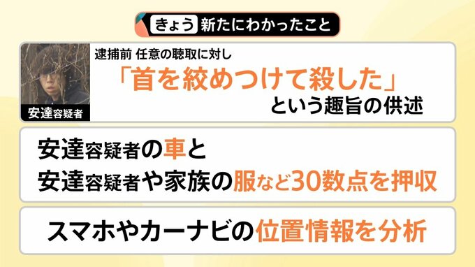 まず、逮捕前の任意の聴取に対し、安達容疑者は「首を絞めつけて殺した」という趣旨の供述をしました。