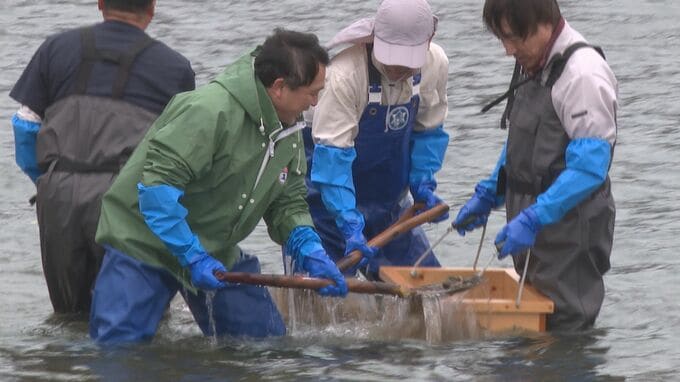 春を呼ぶ風物詩として知られるシロウオの産卵状況の調査が17日、山口県萩市の松本川で行われました。