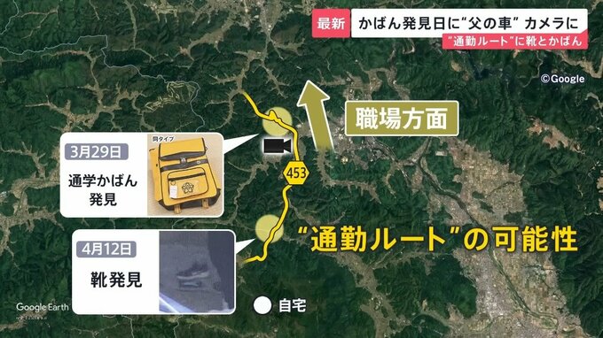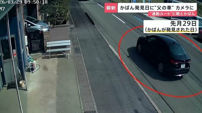 通学かばんが発見された3月29日には、自宅方面から、かばんが見つかった場所の方面に向かう同じ車の姿が捉えられていました。時間は、いつも通るという午前7時台ではなく、午前10時前でした。
