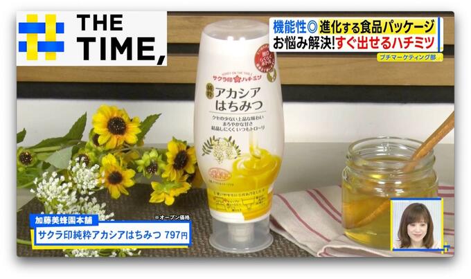 「サクラ印純粋アカシアはちみつ」(加藤美蜂園本舗/300g・797円※オープン価格)は、逆さまに立てて置けるボトルなので、“注ぎ口が下になる”構造。