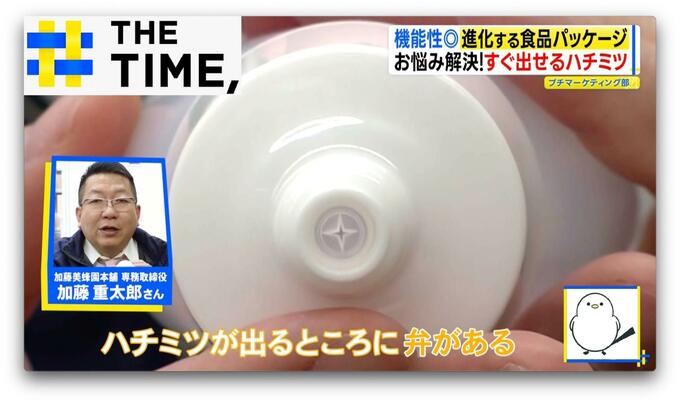 「ハチミツが出るところに“弁がある”。十字に切れ込みが入っているので蜜切れの良い容器」