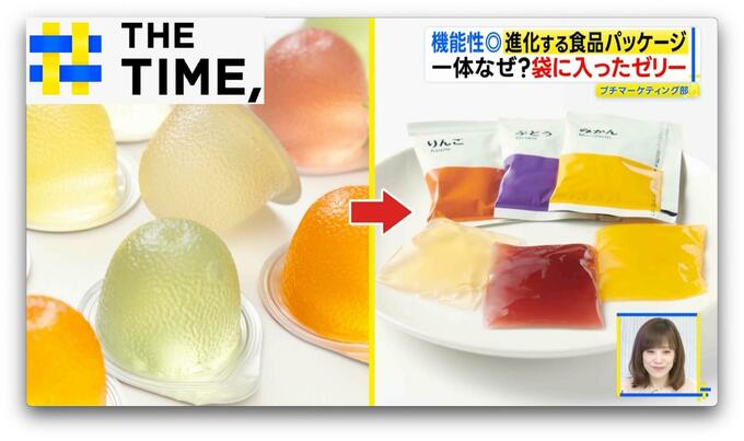 『無印良品』の「冷やしておいしい果汁100%ゼリー 3種のフルーツ」(24個入・490円)は、ミニカップではなく“長方形の平たいパウチ”に入ったゼリー。