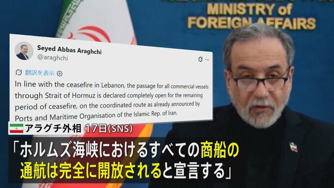 ホルムズ海峡をめぐり、イランは「残りの停戦期間中、完全に開放される」と発表しました。一方、アメリカメディアは、19日にもアメリカとイランによる2回目の協議が行われると伝えています。イランのアラグチ外相は…
