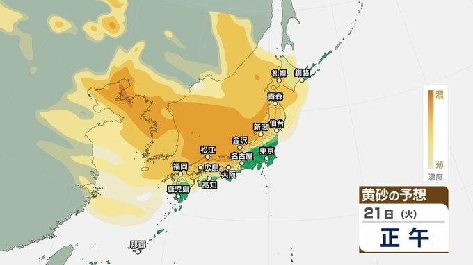 【黄砂情報】21日(火)に向け中国地方含む「日本列島」に飛来か…18日(土)~21日(火)黄砂シミュレーション【気象庁 18日現在】 RSK山陽放送 2026年4月18日(土) 12:00 国内 天気 21日(火) 18日(土)~21日(火)黄砂シミュレーション 18日(土)~21日(火)黄砂シミュレーション 飛来が予測されるエリアでは、洗濯物などを屋外で干す際は注意が必要です。また目、鼻、皮膚などに関するアレルギー体質の方や、喘息など呼吸器に疾患がある方は、十分に注意してください。