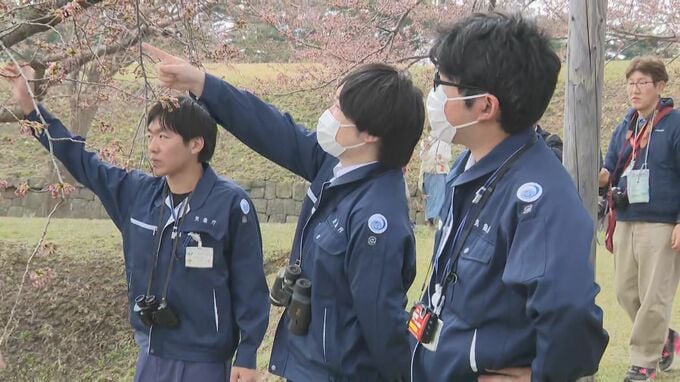 午前10時前に気象台職員が双眼鏡も使って、開花状況を念入りにチェックしました。